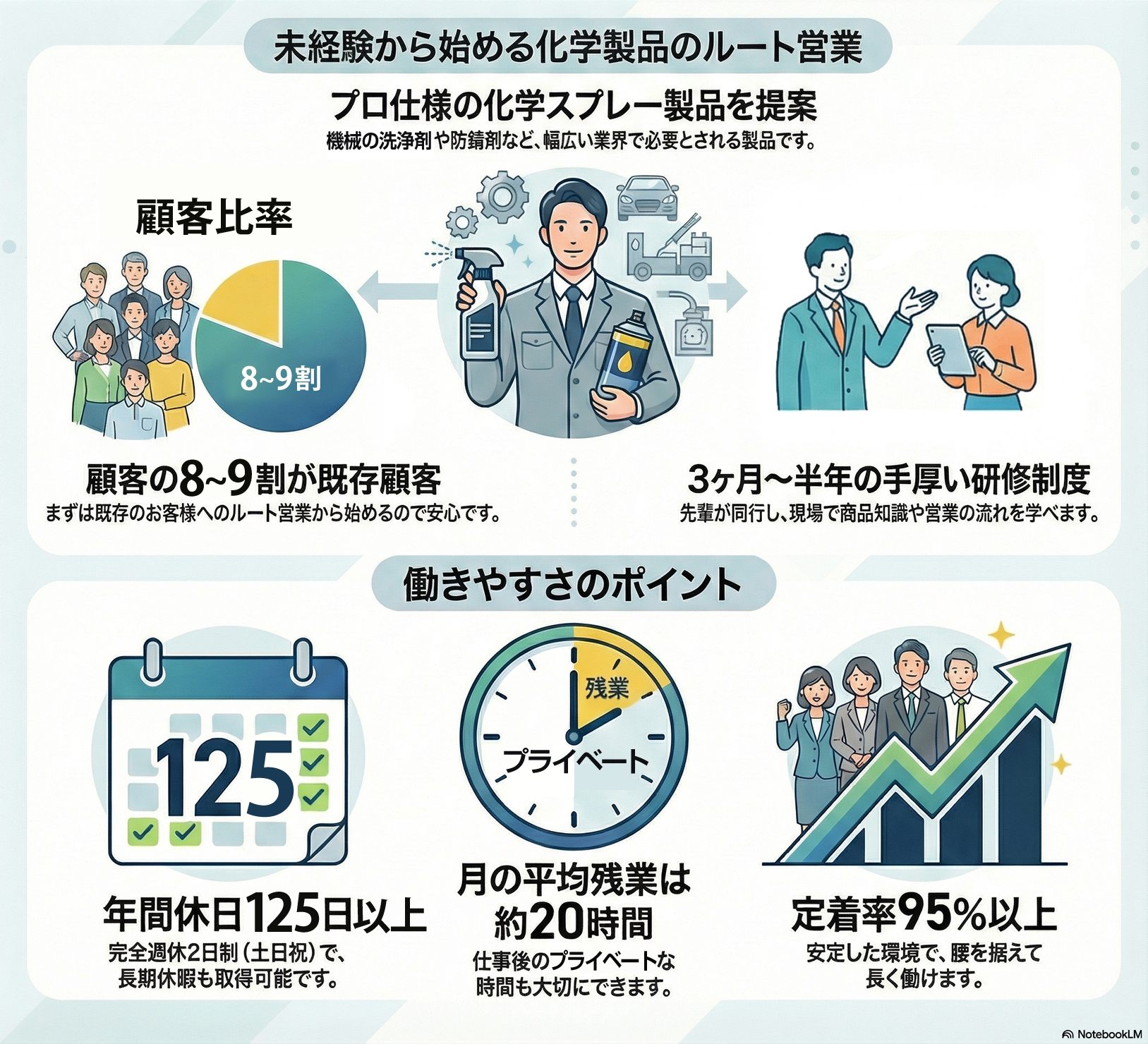 法人のお客様に向けて、潤滑剤・防錆剤・離型剤などの化学製品(スプレー等)を提案するルート営業です。扱うのは、錆び防止や動きを滑らかにするスプレー、樹脂を型から剥がしやすくするスプレー、ボルトを瞬間冷却して緩めるスプレーなど。お客様は印刷・製本、プラスチック、自動車、食品など幅広く、中小〜大手まで担当します。業界知識は不問で、未経験入社の先輩も多数活躍中です。